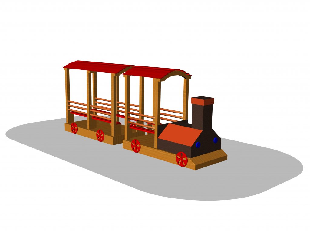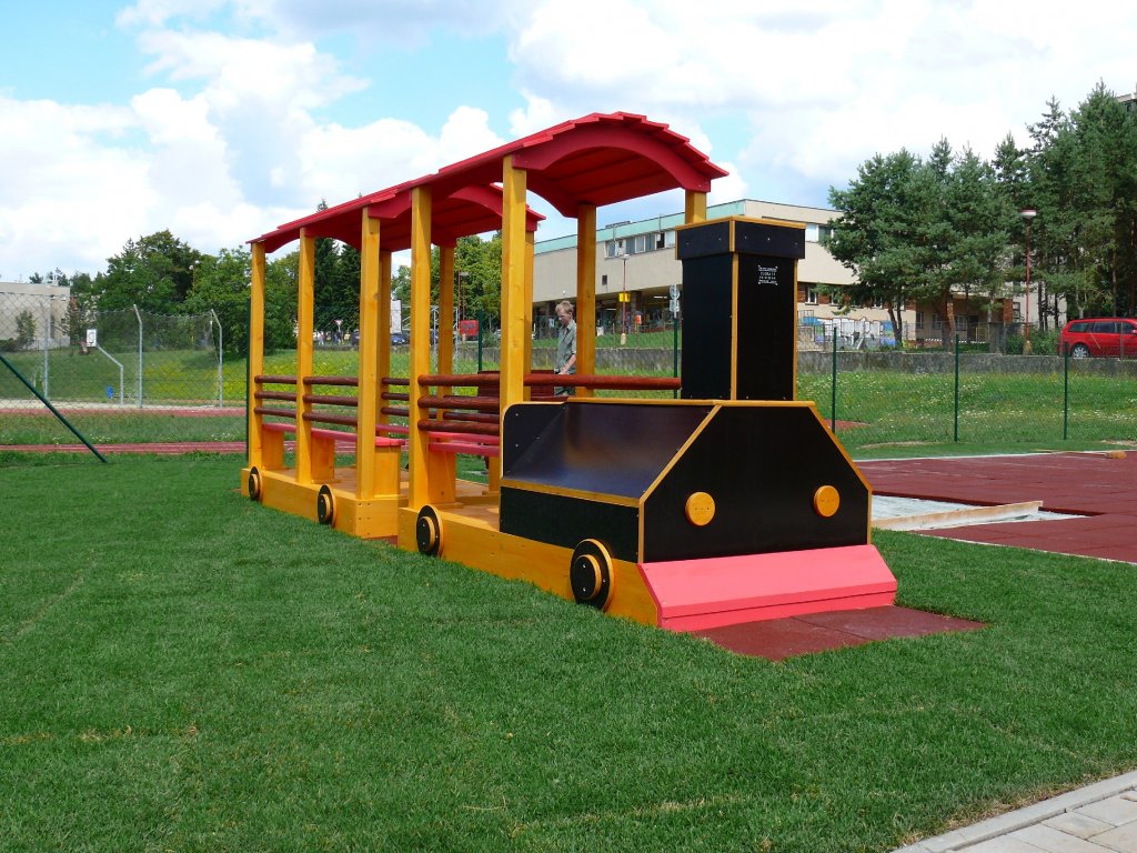 Vláčik a vagón s lavicami. Konštrukcia vláčiku – hranoly 10x10cm opatrené tromi vrstvami lazurovacieho náteru pre vonkajšie použitie pri zachovaní štruktúry dreva. Všetky spoje na vláčiku čapované, zábradlie Ø 5cm zapustené do hranolov – odolné voči vandalizmu. Každý spojovací materiál pozinkovaný alebo nerezový. Kovové časti na konštrukcii sú upravené vypaľovanou práškovou farbou Komaxit. Prvok je certifikovaný podľa EN 1176.